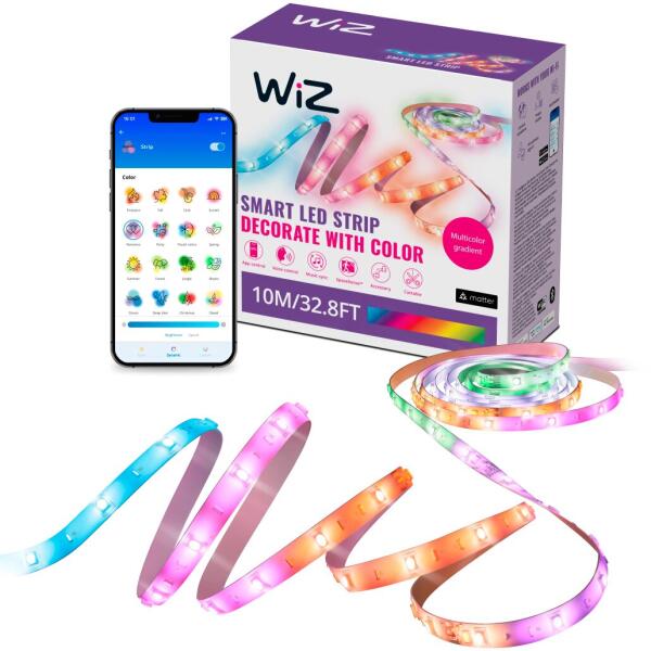 Megjegyzés: Ez a leírás automatikusan le lett fordítva magyarra. LED szalag WiZ RGBIC LED szalag 10m (5+5) Type-C 1PF/4 10 m-es RGBIC fénycsíkjainkat úgy terveztük, hogy közepes méretű terekbe illeszkedjenek, és több mint 16 millió egyszínű színnel szépítsék azokat. Lépjen túl az egyszínű színeken az egyedileg vezérelhető színes szegmensekkel a lenyűgöző hatások érdekében, mint például szivárványok létrehozása, elhalványuló színek és csillogás. Ragassza fel a rugalmas csíkot bárhová, és használja az intuitív WiZ alkalmazást a fények vezérléséhez a meglévő Wi-Fi hálózaton keresztül. A statikus és dinamikus világítási módok, a fényintenzitás intelligens csökkentése és a világítás programozása lehetővé teszi a teljes rendszer irányítását, még akkor is, ha nem tartózkodik otthon. A Google Home, az Amazon Alexa és az Apple HomeKit szolgáltatásokkal működik az eddigi legkönnyebb használat érdekében. Intelligens világítási funkciók, amelyek könnyen konfigurálhatók Azonnal élvezheti az intelligens funkciók előnyeit, ha csatlakoztatja a WiZ lámpát a Wi-Fi hálózathoz. Könnyen vezérelheti a lámpákat, ha távol van otthonától, programozhatja őket úgy, hogy automatikusan ki- és bekapcsoljanak. Nem kell további hardvert, például hubot vagy átjárót telepíteni! Matt minősítés Ez a termék Matter tanúsítvánnyal rendelkezik. Konfigurálhatja és vezérelheti a platformjával. kedvenc intelligens otthona, és zökkenőmentesen működhet más Matter-tanúsítvánnyal rendelkező eszközökkel. Állítsa be a lámpákat a saját ütemtervének megfelelően Automatizálja intelligens lámpáit, hogy kövesse napi vagy heti rutinját. Ütemezze be, hogy a lámpák felgyulladjanak reggel vagy hazaérkezés előtt, és tartsa lekapcsolva, hogy energiát takarítson meg, amikor nincs rájuk szükség. Az eszközök aktiválása mozgással érzékelő használata nélkül A WiZ SpaceSense technológiája átalakítja eszközeit. mozgásérzékelőkben. Aktiválja a SpaceSense funkciót a WiZ alkalmazásban, és hagyja, hogy lámpái és eszközei automatikusan be- és kikapcsoljanak mozgásérzékeléssel. A SpaceSense funkció működéséhez legalább két WiZ-eszközre van szükség egy szobában. Színek milliói és változó fénymódok teszik ragyogóbbá a napot Válasszon tetszőleges világos színt, vagy egyszerűen alkalmazzon egy dinamikus fénymódot, amelyet az Ön számára terveztünk. A kandalló vagy az Óceán például segít csodálatos hangulatot teremteni, és feldobja a hangulatát. Irányítsd intelligens lámpáidat bárhonnan Nem kell aggódnia, ha égve hagyják a lámpákat, m